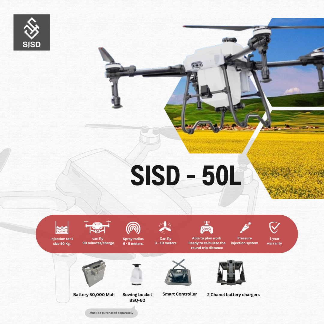 Agricultural drone, model SISD - 50L, full system specifications, usable beyond limits